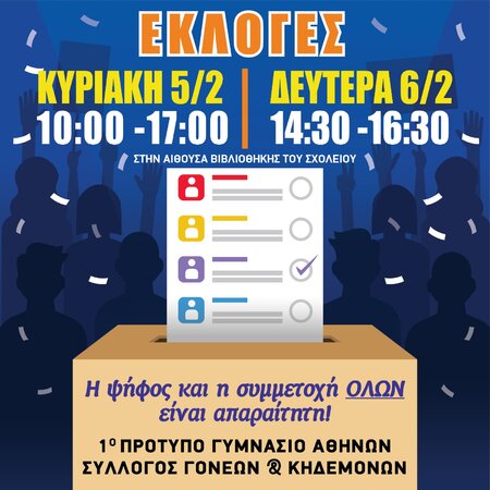 Η εφορευτική επιτροπή αφού συνεδρίασε, αποφάσισε ότι οι ώρες διεξαγωγής της εκλογικής διαδικασίας που θα λάβει χώρα στη βιβλιοθήκη του Σχολείου θα είναι: